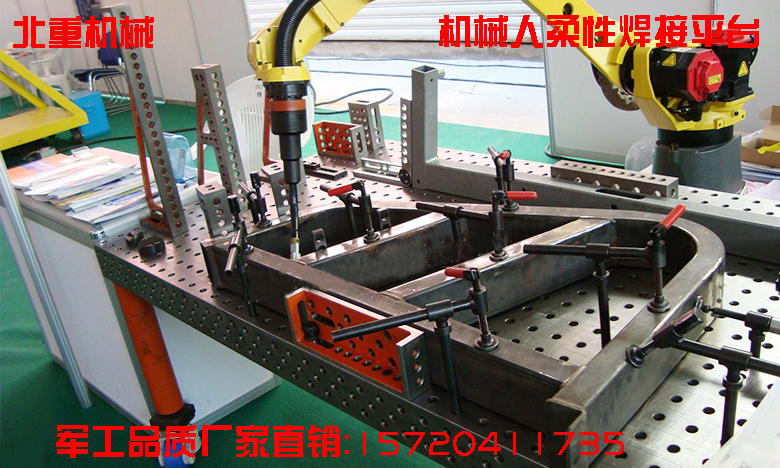 柔性組合工裝夾具是一種三維平面孔系定位夾緊系統(tǒng),采用標準化、系列化、通用化的模塊組成,所有模塊的鏈接、固定和壓緊都是以孔來定位,用鎖緊銷來實現(xiàn)快速鎖緊,模塊與模塊隨著機器人的應(yīng)用越來越廣泛,自動化程度的不斷提高,傳統(tǒng)的裝配、焊接工藝裝備已經(jīng)很難適應(yīng)生產(chǎn)的要求;經(jīng)過我們不斷的實驗創(chuàng)新,研發(fā)出機器人焊接平臺,從此提高生產(chǎn)效率、降低生產(chǎn)成本、提高產(chǎn)品質(zhì)量。利用專用夾具附件完成實現(xiàn)產(chǎn)品的高效率、低成本的生產(chǎn)。